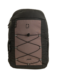Mochila con capacidad de 28 litros color negro y gris malva. El cuerpo es de ripstop repelente al agua, y la base está reforzada con poliéster PVC. Las tiras y la base están acolchadas con foam para mejor soporte.