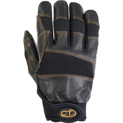 Dorso de tejido elástico transpirable con refuerzos de piel y protección de nudillos, muñeca ergonómica de neopreno con cierre de velcro y cómodo orificio de enganche al arnés.